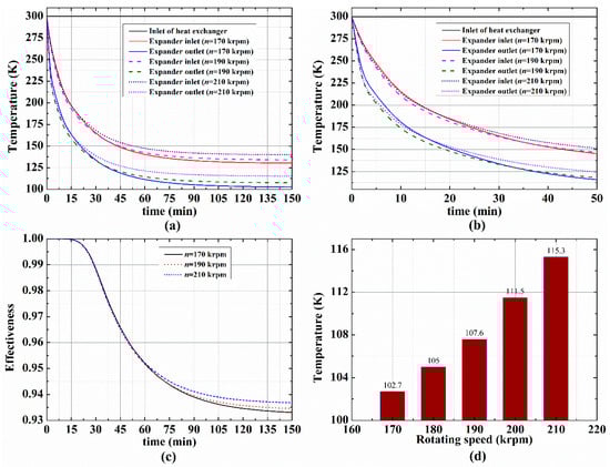 As shown in Figure 8, the dynamic characteristics of the refrigerator under different rotating speeds are presented, both of which operated at the expansion work of 800 W. As shown in Figure 8a,b, the cooling curves are much smoother than those of the refrigerator with certain brake pressure, which means the cooling process is more stable. With fixed expansion work and rotating speed, the variations of expansion parameters might be more controllable, resulting in the slow change of the refrigerator. That is, the more constrains, the less uncertainty. It also can be seen that, with a lower rotating speed, the temperature declines faster first and then slower. As shown in Figure 8c, the heat exchanger effectiveness was nearly the same at the beginning of the cooling process, and increased with the rotating speed later. Although a higher rotating speed was related to higher effectiveness, the refrigerator has poor performance. This shows that the expander efficiency played a more important role in this refrigerator. As shown in Figure 8d, the ultimate temperature of the refrigerator decreases with the increase of rotating speed.