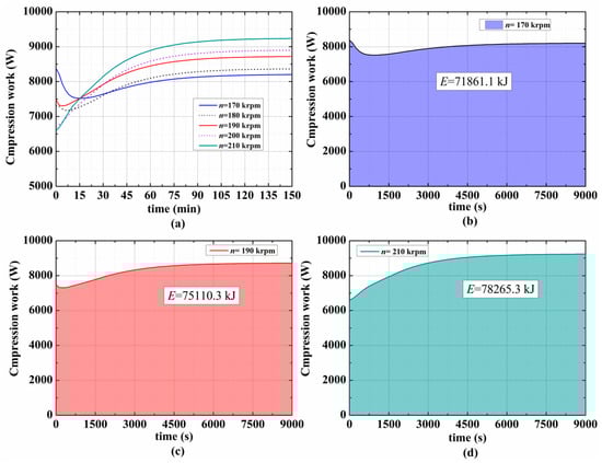 The required compression work of the front-end compressor was also analyzed. The expansion ratio nearly equals the lowest pressure ratio that the front-end compressor (e.g., screw compressor in Figure 2) must provide. The required input energy of the cryogenic refrigerator could be calculated through the integration of compression work using Equation (5). Assuming the compressor operates under and the mass flow rate of 0.03 kg s−1, the input compression works under varied rotating speed were calculated and presented in Figure 10. The curves of compression work are similar to those of the compression ratio (expansion ratio in Figure 9), but the change trends vary less dramatically. Because there is an exponential relationship with them and the index is less than 1.0, as shown in Equation (4). In the figure of compression work with time, the fill area under the curve represents the integration of compression work with time, which is the total energy input in the cooling process, as shown in Figure 10b–d. The total input energies are 71861.1, 75110.3, and 78265.3 kJ at the rotating speed of 170, 190, 210 krpm respectively. Also, the differences are not as large as those of the expansion ratios.