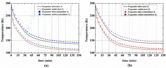 Experiments were carried out to investigate the dynamic performance and verify the simulation method. The cooling characteristics of the refrigerator with energy consumption were studied experimentally. The operating parameters of the tests and simulations are listed in Table 2. In two tests, the refrigerator run under the same expansion ratio and boundary conditions. With optimal expansion efficiency, the expander operated under optimal characteristic ratio through the feedback control []. With certain brake pressure, the blower inlet pressure was fixed in the cooling process. Each experimental data was the mean of three replicates.