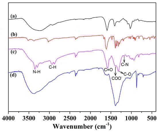 FTIR spectra of (a) sodium alginate, (b) EDTA salt, (c) Alg-EDTA, and (d) Cd2+-loaded Alg-EDTA.