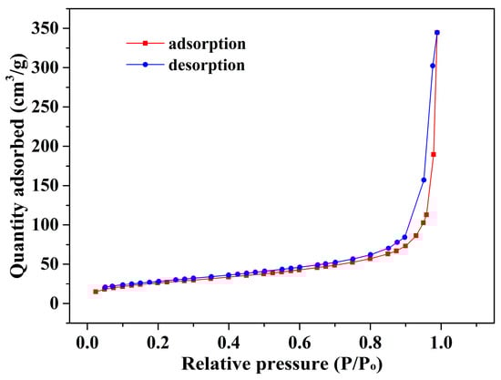 The morphology of Alg-EDTA has been characterized and illustrated in Figure 3. Similar to one of the lunar surfaces, the surface of Alg-EDTA is rough and porous, which increases the contact area of the adsorbent with the solution and provides more binding sites. In addition, the pore properties of Alg-EDTA were also studied by N2 adsorption-desorption isotherm (Figure 4). The results showed that the BET surface area, pore volume, and average pore size of Alg-EDTA are 94.63 m2/g, 53.30 cm3/g, and 22.53 nm, respectively. The rough surface and large pore size are beneficial to the rapid adsorption of the target metal ions and the increase in the metal ion adsorption capacity.