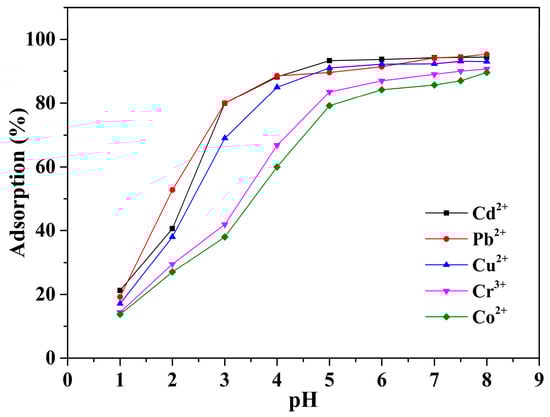 Approximately 100 mg of Alg-EDTA was weighed and added to 50 mL of 1.5 mM Cd2+ (Pb2+, Cu2+, Cr3+ or Co2+) solution of different pH values, stirred for 6 h, and filtered, and the concentration of residual metal ions in the filtrate was determined by ICP-OES. As shown in Figure 5, when the solution pH is less than 1.0, Alg-EDTA can only adsorb 21.3% of Cd2+ (19.2% of Pb2+, 17.1% of Cu2+, 14.4% of Cr3+ or 13.7% of Co2+) probably due to the protonation of carboxyl and amino groups under strongly acidic conditions, thereby reducing the binding sites of Alg- EDTA with heavy metal ions. With increased solution pH, the adsorption capacity of Alg-EDTA for metal ions increases significantly and then stabilizes. The solubility product rule suggests that Pb2+, Cd2+, Cu2+, Cr3+ and Co2+ in the solution will separately form the corresponding hydroxide precipitation when the solution pH is higher than 6.5. Therefore, the optimum pH lies in the range of 4.0–6.5 for adsorption of heavy metal ions by Alg-EDTA.