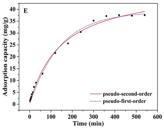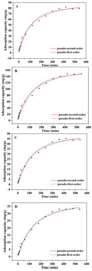 Approximately 100 mg of Alg-EDTA was weighed and added to 50 mL of 1.5 mM Cd2+ (Pb2+, Cu2+, Cr3+ or Co2+) solution at 25 °C, stirred for 2, 4, 6, 8, 10, 12, 15, 20, 30, 40, 50, 60······480 or 540 min, and then filtered. The concentration of residual metal ions in the filtrate was determined by ICP-OES. The experimental results are shown in Figure 6. The adsorption capacity of Alg-EDTA for Cd2+ and Pb2+ increases first, and then remains constant with the increase in the adsorption time. When the adsorption time is 60 min, Alg-EDTA can adsorb more than 40% of heavy metal ions in the solution. While the adsorption time greater than or equal to 360 min, Alg-EDTA can adsorb more than 85% of heavy metal ions in the solution. Therefore, an adsorption time of 360 min was selected in this study. In addition, the pseudo-first-order and pseudo-second-order models were employed to fit the kinetic data in order to study the adsorption mode of metal ions by Alg-EDTA. The fitting results show that the pseudo-first-order and the pseudo-second-order models are fit well with the kinetic data (Table 1), thereby indicating that physisorption and chemisorption are both included in the adsorption mechanism [12,13].