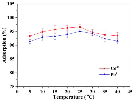 Effect of temperature on metal ion adsorption (100 mg of Alg-EDTA was added to 50 mL 1.5 mM of Cd2+ (or Pb2+) solution at different temperatures).