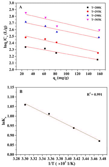 (A) Plots of lnqe/Ce versus qe at different temperatures; (B) plot of lnKo versus 1/T.