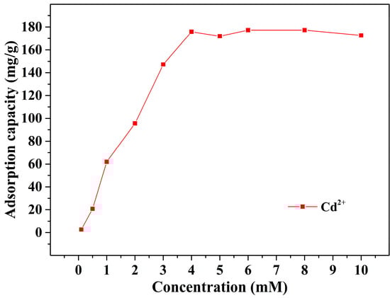 To evaluate the adsorption capability of Alg-EDTA for different heavy metal ions, we conducted single metal ion adsorption and competitive adsorption experiments (Table 3). The experimental results show that Alg-EDTA has good affinity for heavy metal ions, such as Cd2+, Pb2+, Cu2+, Co2+, and Cr3+, and can adsorb more than 80% of the corresponding heavy metal ions in the solution. In competitive adsorption experiments, Alg-EDTA exhibits higher selectivity for Cd2+, it can adsorb more than 90% of Cd2+ in the mixed metal ion solution. This may be due to the fact that the ionic radius of Cd2+ (0.097 nm) is closer to that of Ca2+ (0.100 nm) than Pb2+ (0.132 nm) and Cu2+ (0.072 nm), and thus has stronger ion exchange effect with Ca2+ [16]. We further conducted experiments to determine the maximum adsorption capacity of Alg-EDTA for Cd2+, and the experimental results are presented in Figure 9. As the Cd2+ concentration in the solution increases from 0.1 mM to 4.0 mM, the adsorption capacity of Alg-EDTA for Cd2+ increases rapidly, and then remains stable with further increase in concentration. The maximum adsorption capacity of Alg-EDTA for Cd2+ is 177.3 mg/g, which is higher than most of the reported Cd2+-sorbents (Table 4) [17,18,19,20,21,22,23,24,25,26,27].