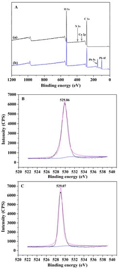 (A) XPS survey of (a) Alg-EDTA and (b) Alg-EDTA loaded Pb2+. O 1s spectra of Alg-EDTA (B) before and (C) after Pb2+ adsorption.