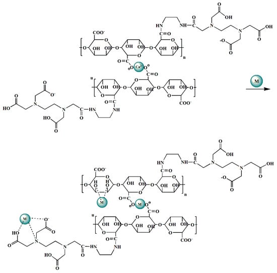 Plausible adsorption mechanism of Alg-EDTA combined with heavy metal ions. M represents heavy metal ions such as Cd2+, Pb2+, Cu2+, etc.