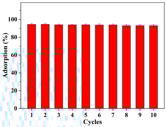 H protons can exchange metal ions attached to the carboxyl group and the amino group by protonation under acidic conditions. Therefore, we use 0.05 M HNO3 as an eluent to elute the Cd2+-loaded Alg-EDTA to achieve regeneration of the adsorbent. As shown in Figure 12, the adsorption rate of Alg-EDTA to Cd2+ still lies in the range of 92.0–95.0% after nine adsorption–desorption cycles, although the morphology of Alg-EDTA changed slightly (from spherical to flat). We propose that the as-prepared Alg-EDTA has stable adsorption performance after the repetition of the usage acting as a potential low-cost and highly-efficient heavy metal ion adsorbent. Moreover, we further analyzed the chemical composition of the Alg-EDTA using an elemental analyzer. Elemental analysis result shows that the C%, N% and H% of initial Alg-EDTA is 35.27%, 15.21% and 3.84%, respectively. The C%, N% and H% of Alg-EDTA after nine adsorption-desorption cycles is 34.36%, 14.47% and 4.05%, respectively. The chemical composition of Alg-EDTA after repeated use is consistent with that before adsorption.