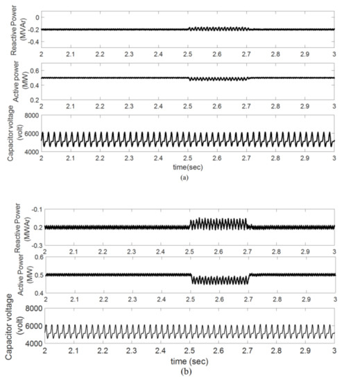 In Phase A, voltage sag is considered to drop 20% at t = 2.5 s over 20 ms. In the beginning, the MMC was delivering 0.5 MW active power and 0.2 MVAr reactive power to the grid. As illustrated in Figure 8, there were oscillations in active and reactive powers during the unbalanced voltage fault. It is observable that the offered current controllers allowed sustained power as demanded by the DC power source during and after the fault. In spite of the imbalance of the AC voltages, the current controller was able to balance the output AC currents. As a result, the active, alongside the reactive powers, started oscillating with the double frequency of an AC grid. Owing to the decoupling between the AC and DC parts, the voltage sag was compensated by the stored energy inside the MMC. Finally, as has been verified, the variation of capacitor voltages were within satisfactory bounds and were not influenced by grid voltage faults, excluding the voltage sag case (c). As illustrated in Figure 9c, the voltage sag due to the double-line-to-ground fault created many oscillations on the active and reactive powers, as well as many distortions of the capacitor voltage. In this situation, a supercapacitor with a high power density would be proposed to absorb the power oscillation during voltage sag and satisfy the voltage ride through condition at the output of the GC-MMC [19].