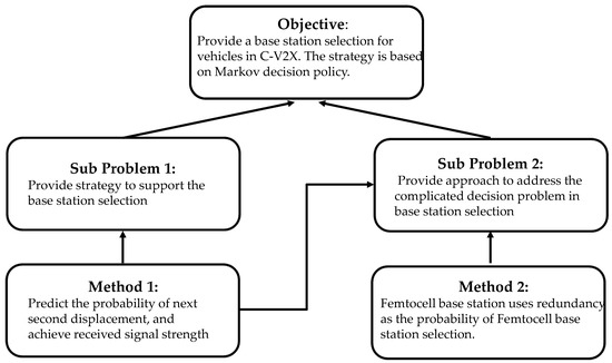 The basic idea of base station selection is illustrated in Figure 2. The objective of this paper is to provide base station selection for vehicles in C-V2X, the strategy of which is based on the Markov decision policy. To achieve this goal, we divided this objective into two subproblems. The first one is providing a strategy to support base station selection. The second is providing an approach to address the complicated decision problem in base station selection. To solve the first subproblem, we propose a method to predict the probability of next second displacement and achieve RSS. We also propose femtocell base station redundancy as the probability of femtocell base station selection to address the second subproblem.