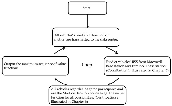 Figure 3 illustrates the workflow of the Markov decision policy. Firstly, all vehicles’ speeds and directions of motion are transmitted to the data center. Then, the expected RSS from the two kinds of base stations is first obtained from the existing vehicle state that is based on our proposed method. As per the Markov decision policy, the two kinds of signal strength are used as a benefit to base station selection. Then, all vehicles are arranged in order. After that, all vehicles compete with the femtocell base station resources. Finally, the best selection strategy is obtained through different permutations and combinations.