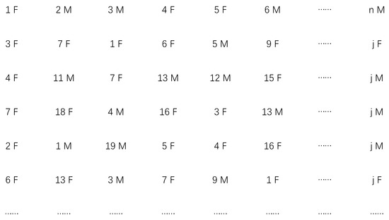 To clearly describe the above mechanism, we provide an example in Figure 4. The number means marked vehicles (ex. 1,2,3…n). M means the macrocell base station that the vehicle selected, and F means the femtocell base station that the vehicle selected. Here, we emphasize that the -th vehicle’s selected base station corresponds to the corresponding .