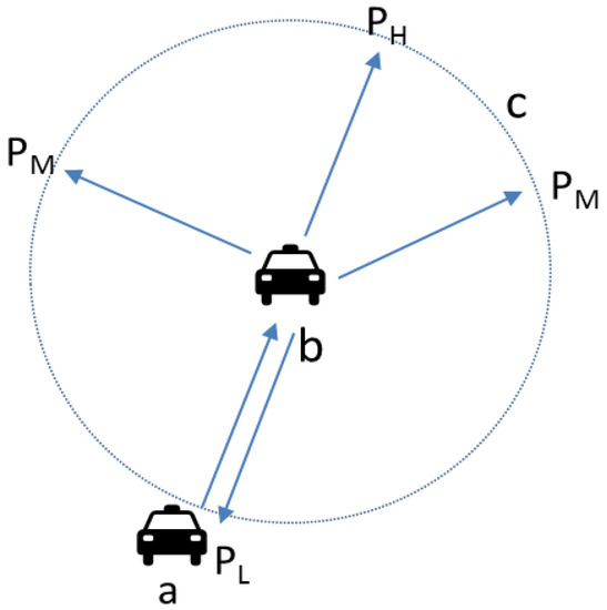 Figure 5 shows, as the system-provided path, that the possibility that a vehicle moves along the direction of the previous step is very high, while the possibility of moving in the opposite direction is very low. The next possible movement location could be treated as a circle, as the vehicle is currently at Position a and moves to Position b in the next second. Therefore, we can define displacement as a vector. In the next second, Position c of the user can be described as a circle. The center of the circle is Position b, and average mobility velocity r is the circle radius. We assume that the probability of the next second where the user moves forward along vector direction is high (). Opposite vector direction could be treated as the lower probability( ). For the remaining probability, turning left or right, we set the probability , which means that this area has normal probability. , , and are shown in Figure 5, which satisfies the relationship: >>.