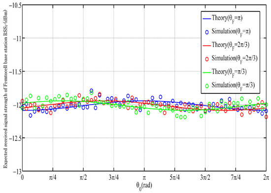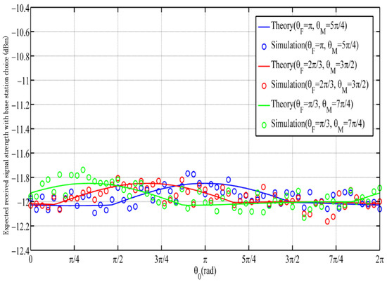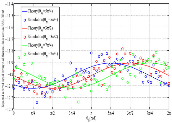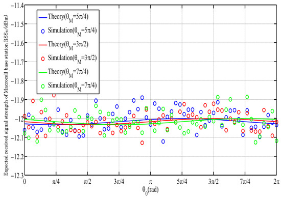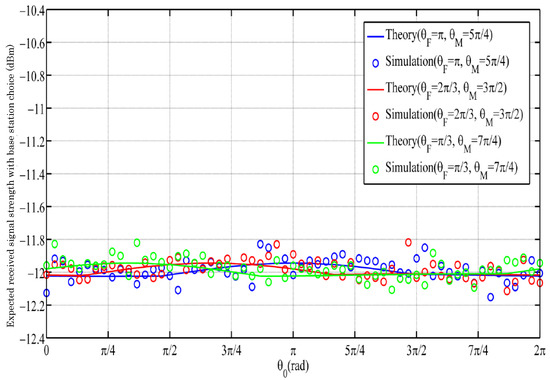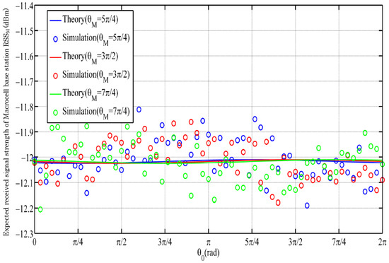 We can see from the results of Figure 7 and Figure 8 that low-speed mobility through traditional base station selection cannot obviously change the RSS. Here, we changed r to 4.5 m/s (middle speed), was randomly set, and the three different colors represent the different locations where the macrocell and femtocell base stations were located. Figure 10 shows the expected RSS we obtained at middle speed with the choice of the macrocell base station. Figure 11 shows the expected RSS we obtained at middle speed with the choice of the femtocell base station. As shown in Figure 12, there was a small efficiency improvement when compared with a traditional base station selection policy at middle speed.