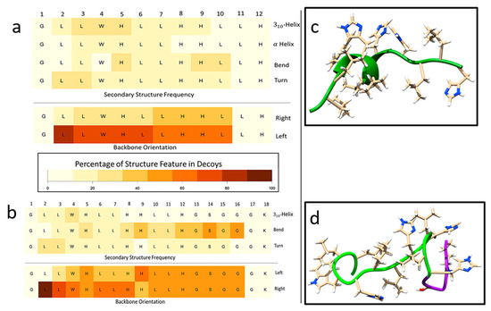 Secondary structures of peptide sequences can also be computationally predicted by generating structure decoys through PyRosetta. The distribution of predicted secondary structural features as a function of sequence residue for GH12 and GH12-M2 are shown in Figure 4a,b. Darker colors denote higher frequencies of the feature labeled at the right-hand side. The residue positions with the highest occurrence of alpha helix are residues 3–7 (LWHLL). The residues with the highest predicted three-helix structure frequencies are residues 3–5 (LWH). It should be noted that the first residue and last two residues cannot be labeled with these three-helix structure features because the definition used by DSSP (Define Secondary Structure of Proteins) requires the presence of adjacent residues. Bends (which are not helices) peaked at residues 5, 9, and 10. Turns, not defined as bends or helices, peaked at residues 2 and 3. The bottom two rows are defined by the direction in which the peptide backbone rotates. For about 80% of the decoys, the leucine at residue 2 is turned right, from residue 3 to 6 about 70% of decoys are turned right, and for residues 7–10 about 60% of the decoys. Figure 4c shows the helix in the GH12 peptide backbone ribbon for the lowest energy score decoy.