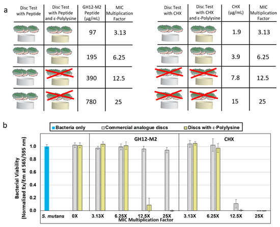 (a) Schematic of adhesive system samples starting with commercial analogue. Experiments included the addition of GH12-M2 antimicrobial peptide onto the discs with ε-polylysine to see bacterial inhibition. As a positive control for antimicrobial activity, chlorhexidine gluconate was added at a multiple of its measured MIC value. 12.5× or greater concentration of CHX was sufficient for bacterial inhibition with or without ε-polylysine. (b) S. mutans UA159 growth/viability based on AlamarBlue assay on dental adhesive discs soaked with either an antimicrobial peptide or a chlorhexidine aqueous solution as a multiple of minimum inhibitory concentration.