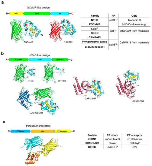 Molecular design of genetically-encoded calcium and potassium indicators. (a,b) The structure of calcium indicators are shown as ribbon diagrams according to the crystal structures of NTnC (protein database (PDB) 5MWC), dYTnC2 (unpublished), GAF-CaMP (combination of GAF-domain of PaBphP phytochrome PDB 3C2W and CaM/M13-peptide pair from GCaMP6m GECI PDB 3WLD), NIR-GECO1 (combination of the PAS-GAF domain of PaBphP phytochrome PDB 3C2W and CaM/M13-peptide pair from GCaMP6m GECI PDB 3WLD), LUCI-GECO1 (combination of NanoLuc luciferase PDB 5IBO and GCaMP6m GECI PDB 3WLD), FGCaMP (unpublished), and K-GECO (PDB 5UKG) in calcium-bound state. (c) The organization of potassium indicators is shown schematically and according to the X-ray structures of Cerulean and mVenus fluorescent proteins (PDB 5OXC and 1MYW, respectively), and Kbp potassium binding protein from E.coli (PDB 5FIM).