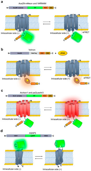 Molecular design of selected genetically-encoded and hybrid fluorescent voltage indicators. (a) eFRET-opsin voltage sensors Ace2N and VARNAM. (b) Hybrid eFRET-opsin voltage sensor Voltron. (c) Opsin-based voltage sensors Archon1 and paQuasAr3. (d) VSD-based voltage sensor ASAP3.