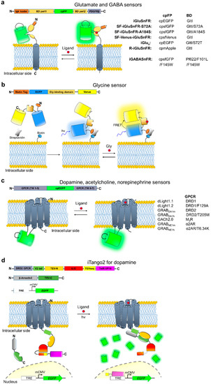 Molecular design of genetically-encoded neurotransmitter indicators. (a) PBP-based glutamate and GABA sensors. (b) PBP-based glycine sensor. (c) GPCR-based dopamine, acetylcholine, and norepinephtine sensors. (d) iTango2 system for dopamine detection.