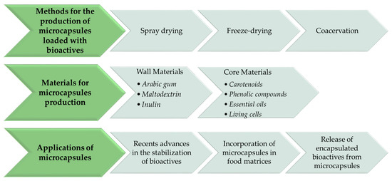 The present work highlights the recent advances in stabilization strategies for the production of microcapsules loaded with bioactive natural materials for food applications. It includes the most commonly used encapsulation processes, the bioactive materials studied as core materials, and the food grade biopolymers used as wall materials. Additionally, attention is also focused on the stability of the encapsulated core materials upon incorporation in food products and the release properties in the gastrointestinal tract after ingestion in order to envisage their potential bioavailability (Figure 2).