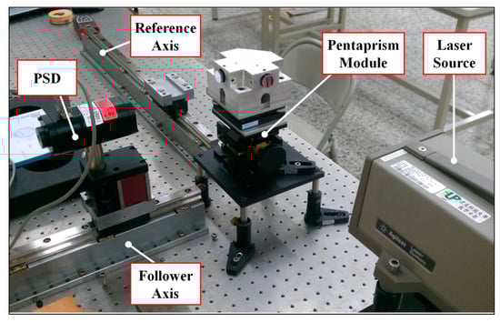 The proposed straightness measurement module is composed of a PSD (Dual lateral), a signal processor, a data acquisition card (USB-6210, National Instruments Co., Taipei, Taiwan), and a laser source, as shown in Figure 4. The straightness error is the extent of the actual path deviating from a straight line, which can be divided into horizontal and vertical straightness errors [19].