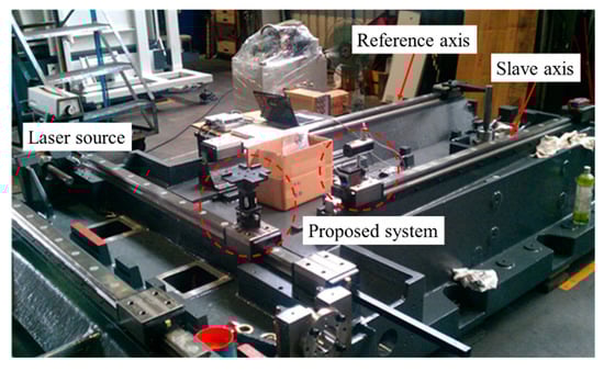 The first case was for the straightness measurement of machine tool in fabrication site. We compared the proposed system with commercial straightness measurement equipment (ProLine, Status Pro Maschinenmesstechnik GmbH, Bochum, Germany). Total measurement range was 6000 mm, the application setup is shown in Figure 20, the proposed system installed in parallel with the ProLine on the saddle of the machine tool. The measurement results are shown in Table 6.