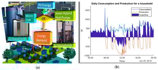 PowerMatching City: (a) scheme of the system, (b) energy consumption (blue line), energy production (red line), and power flow (blue area) for a household with photovoltaic (PV) systems and Micro-combined heat and power (μCHP) jointly producing energy, in the winter of 2012. Negative power flows indicate that power is fed to the grid.