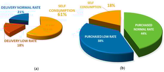 PowerMatching City electricity purchase, self-consumption, and production in 2012: (a) Electricity generated by PV and μCHP; percentages of self-consumption and electricity delivery depending rates; (b) Self consumption and electricity purchased from the grid, with purchase percentages depending on rates.