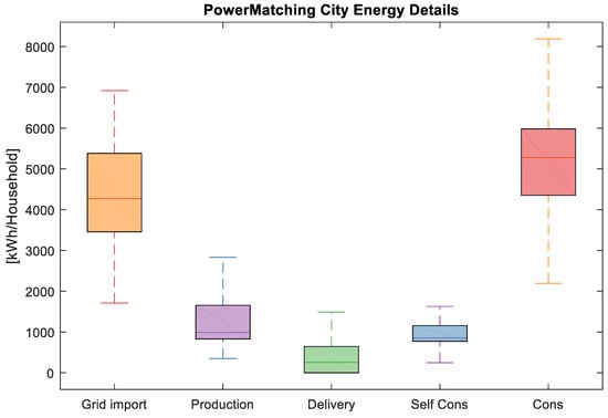 Main features of PMC households are summarized in Table 1 [,]. Ten out of twenty-two households owned a µ-CHP unit with a nominal power of 1 kW of electrical energy. Adding to that, a µ-CHP unit was able to produce 6 kW thermal energy to heat the house, using a hot water buffer of 210 L. Four of the households had rooftop PV installations with an area and nominal power given in Table 1. Through the local smart grid, 18 other households virtually shared a PV system on a farm located 2.3 km from Groningen, the actual location where this smart gird pilot is installed. Each household received a nominal power of 1590 Wp from this farm.