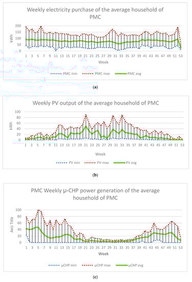 PowerMatching City (PMC) weekly values of (a) electricity purchase, (b) PV output, and (c) μ-CHP (micro-combined heat and power) power generation.