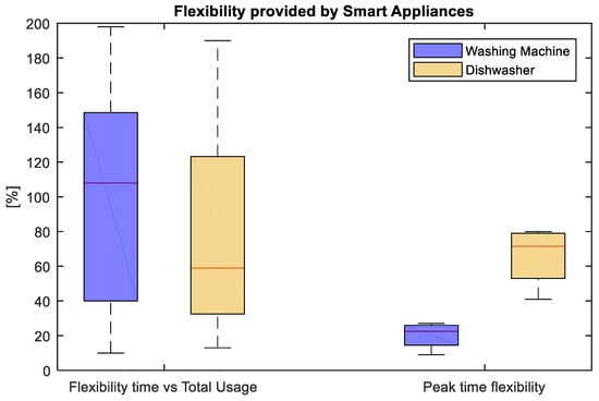 Those percentages should be considered with the semi-automatic flexibility that it could contribute by users entering a latest run time. By using the same equations presented in Table 2, we considered this time how much the two smart appliances were shifted compared to their use time. The flexibility period offered by smart washing machines (WM) was similar to the usage time in median value and 60% for the smart dishwasher (DW) in comparison to the usage time (Figure 5).