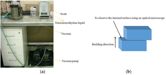 The different procedures based on the Archimedes method were applied to measure the relative density of test samples with reference to ASTM standards [23,24]. Table 3 shows the detailed test procedures. The balance Jewel Lab FA2204B with a capacity of 220 g and an accuracy of ±0.1 mg was used for mass measurement. The vacuum pump was used to generate a vacuum environment for liquid-impregnation. The equipment is shown in Figure 1a.