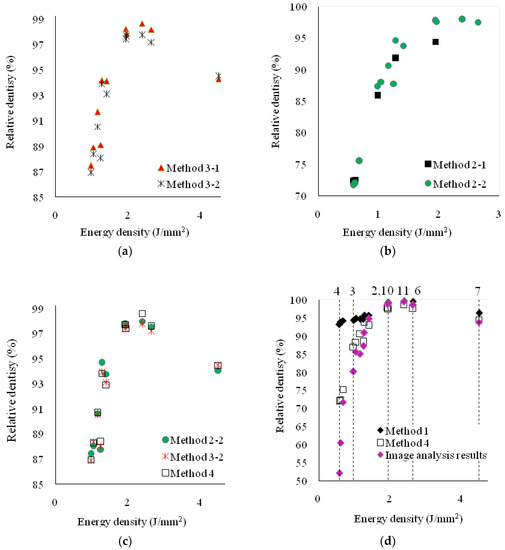 Comparison of results of relative density using different methods: (a) comparison of method 2-1and method 2-2; (b) comparison of method 3-1, method 3-2; (c) comparison of method 2-2, method 3-2 and method 4; and (d) comparison of method 1, method 4, and image analysis.