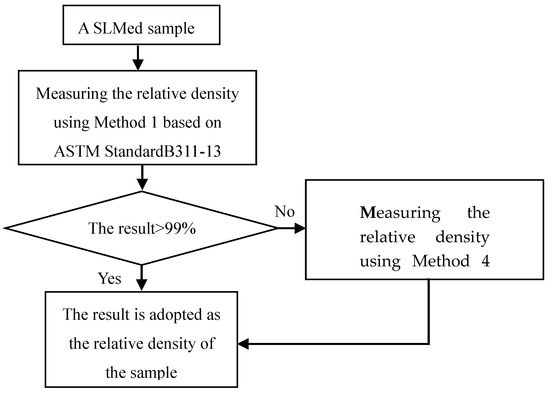 In Figure 4, firstly, the Archimedes method without considering the effect of open cavities according to ASTM Standard B311-13 is applied to measure the relative density of anAlSi10Mg SLMed sample. If this relative density is more than 99%, this result is adopted. Otherwise this same sample needs to be measured again using the Archimedes method considering the effect of open cavities according to ASTM Standard B962-13 (or method 2-2, method 3-2 in Table 3), and then the result is adopted as the relative density result of the sample.