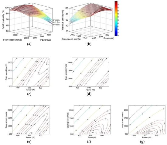 Figure 5a–f show the 3d response surfaces and the 2D contours reflecting the change of relative density with power and scan speed at some specified hatching distance. According to the contour in Figure 5d–f, if the hatching distance being given out of the experimental range of 0.3 mm < h < 0.4 mm, the optimum combinations of parameters corresponding to the highest predicted value of relative density would be in the different ranges of parameters.