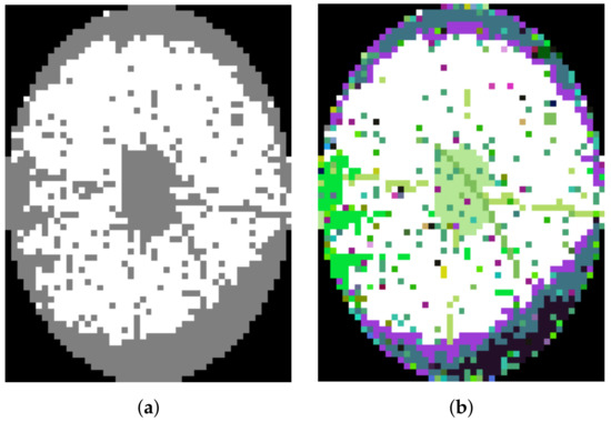 Examples of WBMs with different coloring schemes: (a) WBM in which bins that passed all EDS tests are white and all the other bins are gray, (b) WBM in which bins that passed all EDS tests are white and other bins are randomly assigned a color according to the bin code.