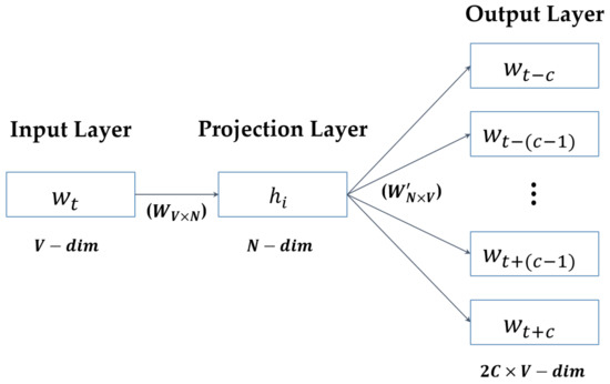 Word2Vec is the most widely used neural network-based distributed representation method that represents a word by a numerical vector in a fixed dimension [27,28]. Traditional one-hot encoding cannot preserve the semantic relationship because a word is represented by -dimensional vector ( is the number of unique words in the dataset) with only one element with the value 1, and all other elements being 0. In contrast, Word2Vec can preserve the semantic relationship between words.
