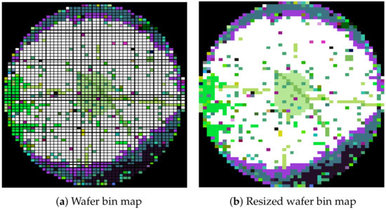 In this study, the original WBMs have the size pixels. Each pixel in a WBM can have a value between and 9999. Although the nine product groups have the same raw WBM size, the actual number of dies on the wafer along the horizontal and vertical axes are different. Table 2 lists the number of unique bin codes, the number of dies along the horizontal/vertical axis, as well as the number of total, good, and bad wafers and their proportions. Group 1 has the largest number of WBMs, containing 5464 WBMs with dies. In contrast, Group 9 has the smallest number of WBMs, containing 1715 WBMs with dies. For the current manufacturing process of the company, a total of 10,002 bin codes are possible for the dies, as explained with Table 1. However, only a small portion of them actually appeared: Group 1 has the largest number of unique bin codes (401), whereas only eight bin codes appear for Group 6. Although the size of raw WBMs is pixels, each die is represented by , , or pixels according to the product type, and the same bin codes are assigned to the pixels for the same die. Hence, we resized the original WBM by aggregating the pixels for the same die so that a die is presented by a pixel in the reduced WBM as shown in Figure 4.