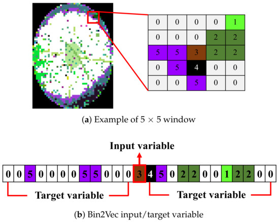 To train the Bin2Vec model, a total of 25 bin codes with size are taken to make a training instance, as shown in Figure 5a. This square matrix is then reshaped into a 25-dimensional vector: the first column becomes the first five elements and the last column becomes the last five elements, as shown in Figure 5b. This sampling and reshaping process for a single wafer is repeated by sliding the step size by one. For example, Group 1 products have dies on a wafer, and we assign the index from top to bottom, and from left to right. The first training instance is made by taking 25 dies with index of 1–5 (horizontal) and 1–5 (vertical). If horizontal sliding is done first, then the second training instance is made by taking 25 dies with index of 2–6 (horizontal) and 1–5 (vertical). This process is repeated until the 25 dies with index 19–23 (horizontal) and 23–27 (vertical) are taken. With these vectorized bin codes, we employed the Skip-Gram structure [27] to learn the embedding vectors. The bin codes in the middle, i.e., the bin code in the third row and third column in the bin matrix, or the 13th bin code in the 25-dimensional vector, were used as the input while the other 24 bin codes were used as the target of the Skip-Gram model, as shown in the first two steps in Figure 6. During the Skip-Gram model training, we excluded the following two cases because they do not have any significant information: (1) instances when all elements have the same bin code, and (2) instances that contain only “‒2” (non-wafer part) and “0” (the die passed all the EDS tests).