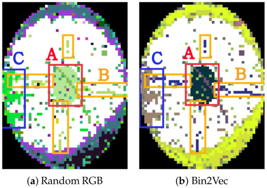 Figure 9 shows two examples of WBMs where a significant bin pattern is recognized only with Bin2Vec. Figure 9a–c are the WBMs for a wafer and Figure 9d–f are the WBMs for another wafer. In Figure 9a,b, the bins seem to be randomly distributed and no significant patterns are recognizable. However, it can be observed that there is a clear cross bin pattern in dark blue when Bin2Vec is applied. Similarly, it is hard to find a circular bin pattern in Figure 9d,e, but a circular bin pattern was discovered (color blue) by Bin2Vec.