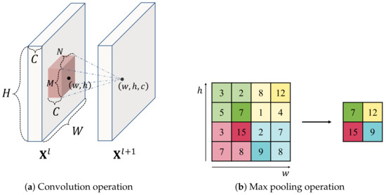 Once the convolution operation is completed, the pooling operation is conducted to reduce the width and height of features maps but preserve significant information, which helps improve the computational efficiency of CNN models. Max pooling and average pooling are the most commonly used pooling methods; we adopted max pooling since it focuses on the most important pixel in the receptive field. Figure 11b shows an example of max pooling operation with size of .