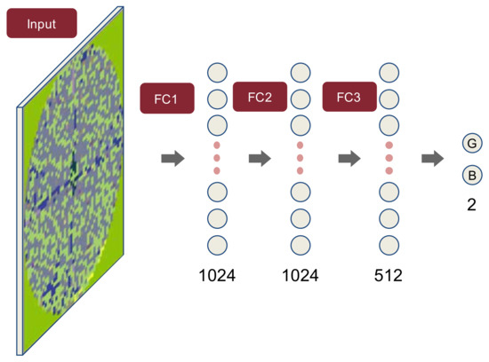 A feedforward MLP with three hidden layers was employed in this study. As shown in Figure 13, the number of hidden nodes was set to 1024, 1024, and 512 for the first, second, and third hidden layers, respectively. The ReLU activation function was used for the first and second hidden layer while the softmax function was used for the third hidden layer. Batch normalization is applied to each layer and the dropout rate of 0.5 was used [37] for the weights between the third hidden layer and output layer. The learning rate started at , decayed by every 5000 iterations, and trained 15,000 iterations in total. We used the Adam optimizer for the first 10,000 iterations and then changed it to MGD. Similar to CNN, the batch size was set to 32, consisting of 16 good and 16 bad WBMs.