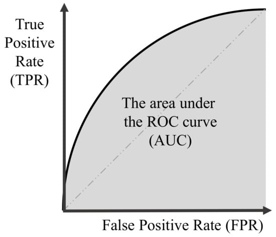 The five performance evaluation criteria described above depend on the cut-off values. To compare the intrinsic ability of classification models, cut-off independent performance evaluation criterion is needed. The receiver operating characteristic (ROC) curve shows the relationship between the false positive rate (x-axis) and true positive rate (y-axis) by varying the cut-off from tightest value to the loosest value. The ROC curve always starts from and ends with . The area under the ROC curve (AUROC) is shown in Figure 14, and is commonly adopted as a cut-off independent performance metric. The AUROC ranges between 0.5 (random model) and 1 (ideal model); the larger the AUROC, the better the classification model.