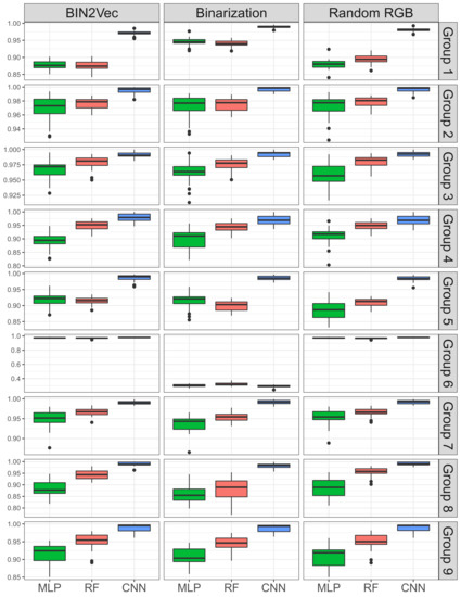 Except for product Group 6, which will be discussed later, the proposed CNN model outperformed the MLP and RF with all WBM coloring schemes for all performance evaluation criteria. Not only did it yield the best performance for all product groups, it also resulted in the most stable performance; the standard deviations for 30 repetitions are much smaller than those of MLP and RF. The BCR of the CNN model improved by 8.13% on average (min: −0.44% for product Group 6 with binary, max: 22.6% for product Group 9 with random RGB), and the F1-measure of the CNN model improved by 15.14% on average (min: 0.98% for Group 6 with random RGB, max: 36.8% for product Group 6 with binary). In addition, the AUC of the CNN model improved by 0.04 on average (min: −0.029 for product Group 6 with binary, max: 0.12 for Group 8 with binary). These improvements are all statistically significant at significance level of 0.01. Between the MLP and RF, RF generally yielded better bad wafer classification performance than MLP. The average differences between BCR, F1-measure, and AUC are 3.24%, 0.72%, and 0.02, respectively.