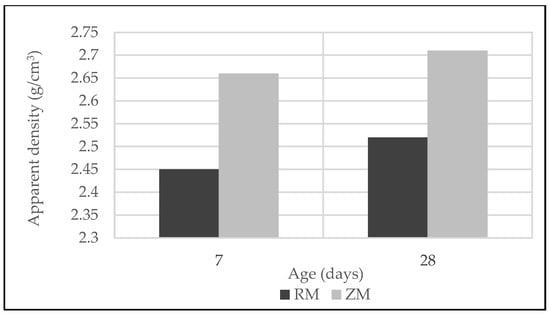 The samples of mortar with ZrO2 nanoparticles, ZM, exhibited different results in their physical properties when compared to the reference mortars, RM, as shown in Figure 5. Apparent density of ZM after 7 days of curing reached 2.66 g/cm3 with 35.8% of permeable pore volume while, at 28 days, it reached its maximum of 2.71 g/cm3. Apparent density of RM was 2.45 and 2.52 g/cm3 at 7 and 28 days respectively, with a permeable space volume of 36.6%.
