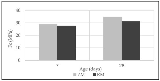 Regarding the compressive strength of RM and ZM mortars, results for 7 and 28 days of curing are shown in the graph of Figure 6. At 7 days, ZM mortars showed greater resistances than those of RM mortars. Following the same trend, after 28 days, compressive strength of ZM mortars surpassed the values of reference mortars.