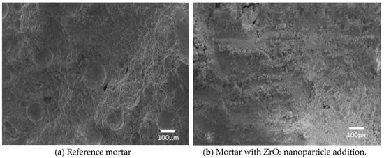 As for SEM, the microstructural development analysis of reference mortars and of those with ZrO2 nanoparticle addition was carried out after 28 days of curing. The image in Figure 7 corresponds to micrographs of the surface of fractured mortars at a magnification of 100×. Reference mortar corresponds to Figure 7a, where a high percentage of voids (or holes) generated during cement hydration, oscillating around 20 to 250 μm, can be observed; the large reliefs shown in the image may correspond to the specimen fracture behavior. Figure 7b corresponds to the ZrO2 nanoparticle-added mortar where large voids or holes are not observed, although there is a considerable porosity appearance.