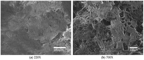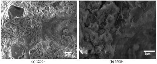 Figure 8 shows micrographs corresponding to RM at higher magnifications. In Figure 8a, the distinctive microstructural characteristics of hydrated cement can be observed, such as the tobermorite gel phase (C–S–H), which is the non-crystalline phase overlapped, or joined, around some limestone aggregates grains, some of them fractured [35]. The generation of ettringite crystals can be noticed in the interface zone between the tobermorite and the aggregate, at the edges, and at the center of holes. Large portlandite crystals (Ca(OH)2), with sizes around 5 μm, can also be noted clearly seen in the micrograph in Figure 8b, which corresponds to a magnification in the vicinity of the gap. The tobermorite phase can also be observed, some portlandite crystals distributed between the specimen and areas with intertwined crystals in the form of small needles corresponding to ettringite crystals.