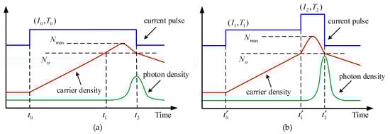 Figure 1 shows the evolution in the carrier and photon densities during a gain switch cycle, assuming that the bias current is 0 and that the initial photon density in the laser can be ignored. A rectangular wave modulation process is given in Figure 1a: At time , a current pulse is applied to a laser with the amplitude of and pulse width of . The initial rate of increase in photon density is very low, due to its low initial value. Without being significantly consumed by stimulated emission, injected electrons rapidly build the carrier density up to threshold at time . After that, the population inversion can be achieved, and the laser begins to emit the light pulse. When the stimulated emission begins to consume the carrier significantly, the population inversion reaches the maximum value . With the generation of laser pulses, the carrier density drops to the threshold at time , at which point the output pulse power reaches its peak value. At this time, the current should be terminated quickly to restrain the secondary oscillation. Therefore, to form a single pulse output with high peak power, the rectangular current pulse must be terminated for the first time when the carrier density drops to the steady-state threshold [20].